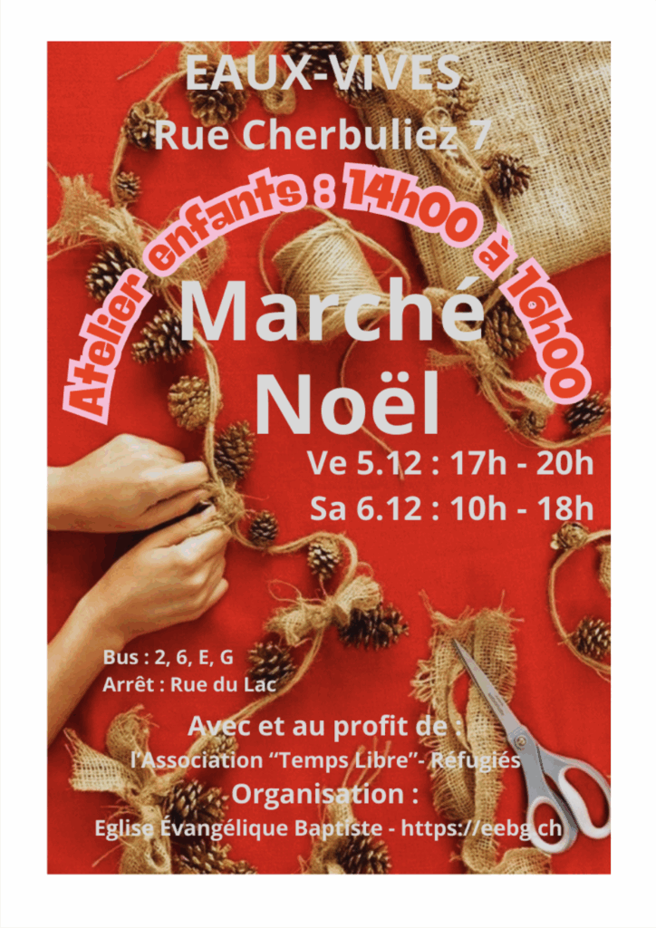 Le vendredi 5 décembre et le samedi 6 décembre, l’église Évangélique Baptiste vous invite à un marché de Noël au profit et avec l’association Temps Libre (œuvre parmi les réfugiés). Vente de produits d’artisanats (couture et broderie sur place, cuir, bijoux, cartes, crochet, savons, confitures, biscuits, etc).